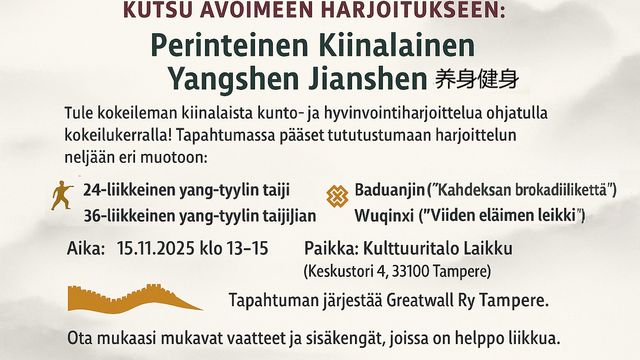 Tule kokeilemaan kiinalaista kunto– ja hyvinvointiharjoittelua ohjatulla kokeilukerralla: 24-liikkeinen yang-tyylin taiji, 36-liikkeinen yang-tyylin taiji jian, Baduanjin, WuqinXi