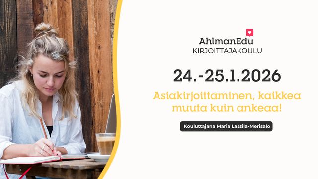 Kahden päivän työpajassa syvennymme kiinnostavien ja vaikuttavien asiatekstien kirjoittamiseen. Tavoitteena on saada viikonlopun aikana napakan pituinen asiateksti hyvään vauhtiin tai jopa valmiiksi.