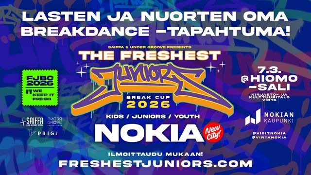 Lasten ja nuorten omat breikkikisat tuovat katutanssin energian uutena kaupunkina suoraan Nokian ytimeen, kirjasto- ja kulttuuritalo Virran Hiomo-saliin!