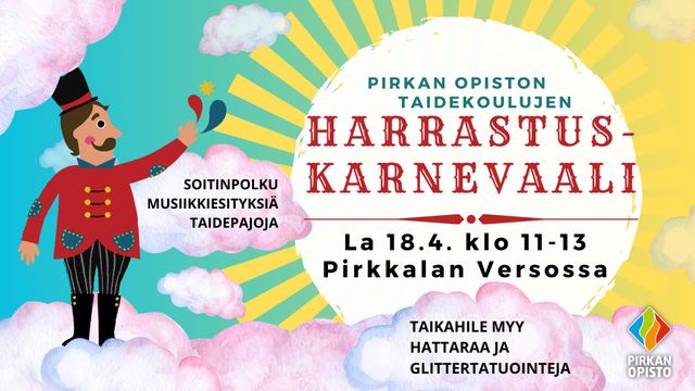 Tervetuloa Pirkan opiston taidekoulujen Harrastuskarnevaaliin! Tapahtumassa pääset kokeilemaan erilaisia soittimia, kuulemaan musiikkiesityksiä ja löytämään oman luovuutesi! Vapaa pääsy!