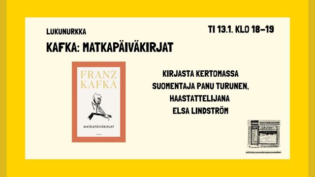 Tammikuun Lukunurkka-illassa keskustellaan Franz Kafkan Matkapäiväkirjat -teoksesta. Vieraana suomentaja Panu Turunen, Elsa Lindström haastattelee.