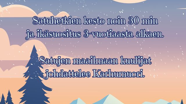 Karhumuorin satuhetket talvella 2026 Kangasalan pääkirjaston Satumetsässä: La 17.1. klo 10.30 La 14.2. klo 10.30 - osana Lasten Pirkkaset -kulttuurikuukautta Satuhetkien kesto on noin 30 min.