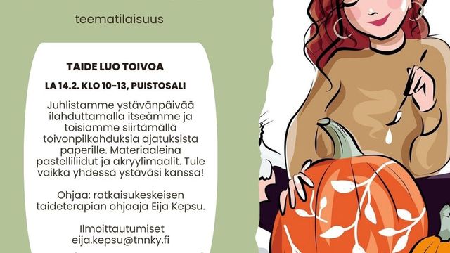Juhlistamme ystävänpäivää ilahduttamalla itseämme ja toisiamme siirtämällä toivonpilkahduksia ajatuksista paperille. Materiaaleina pastelliliidut ja akryylimaalit. Tule vaikka yhdessä ystäväsi kanssa!