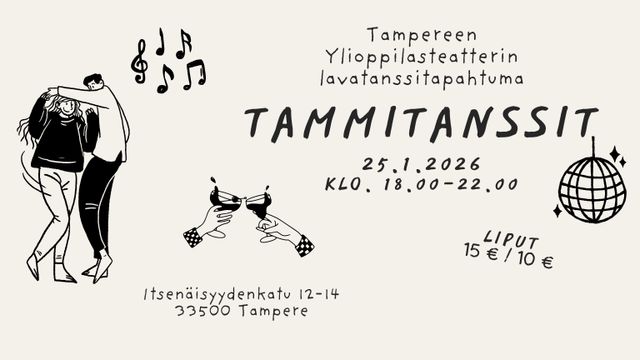 Suursuosion saavuttaneet Tammitanssit jälleen ylioppilasteatterilla! Tule nauttimaan tanssien ihanasta tunnelmasta, tanssin pyörteistä, livebändin musiikista ja baarin antimista!