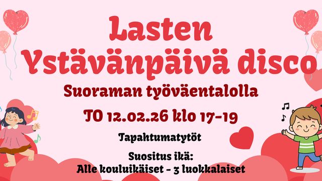 Tervetuloa pikkuväen Ystävänpäivä juhliin discon pyörteisiin. Paikkana tunnelmallinen Suoraman työväentalo. Torstaina 12.2.2026 Klo 17-19