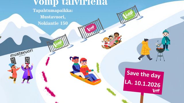 Vomp & Friendin järjestämä ilmainen Vompin talvirieha koko perheelle Ohjelmassa: •klo: 11-15 Pulkkamäki •klo: 12-13 Lumiveistospaja •klo: 13.30-14.30 Lumidisco Tarjolla: Mehua ja kaakaota!