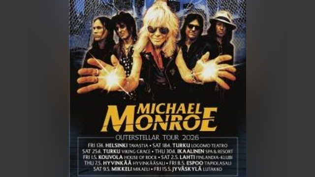 Michael Monroen Outerstellar-levyä juhlistetaan Suomen-kiertueella huhti-toukokuussa Rocklegenda Michael Monroe julkaisee uuden Outerstellar-albuminsa 20. helmikuuta 2026, ja lähtee heti tuoreeltaan laajalle levynjulkaisukiertueelle. Englannista 24. helmikuuta käynnistyvä kiertue rantautuu Suomeen